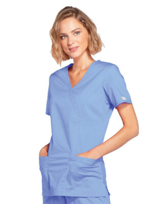 Size- XXS-5XL; A Modern Classic fit mock wrap top features front princess seams and double needle top stitch detail. Also included are front patch pockets, a right side pocket with a sectional pocket and I.D. loop, and a left side pocket with an instrument loop holder across pocket. Back princess seams and side vents complete the picture. Center back length. Length: 27″; Cell Phone Pocket, Patch Pockets, Pen Slot. FABRIC INFO & CARE: Machine wash cold with similar colors. Do not bleach. Tumble dry low. Cool iron if needed.